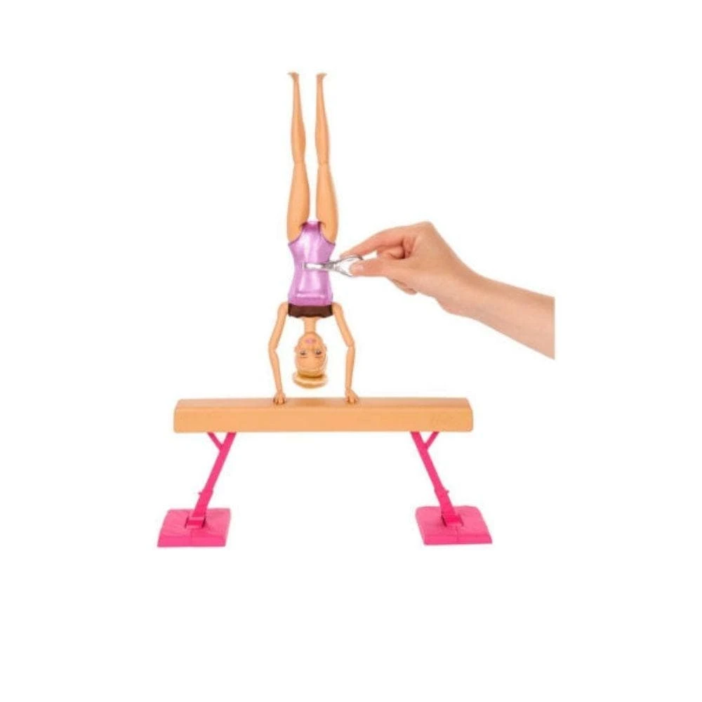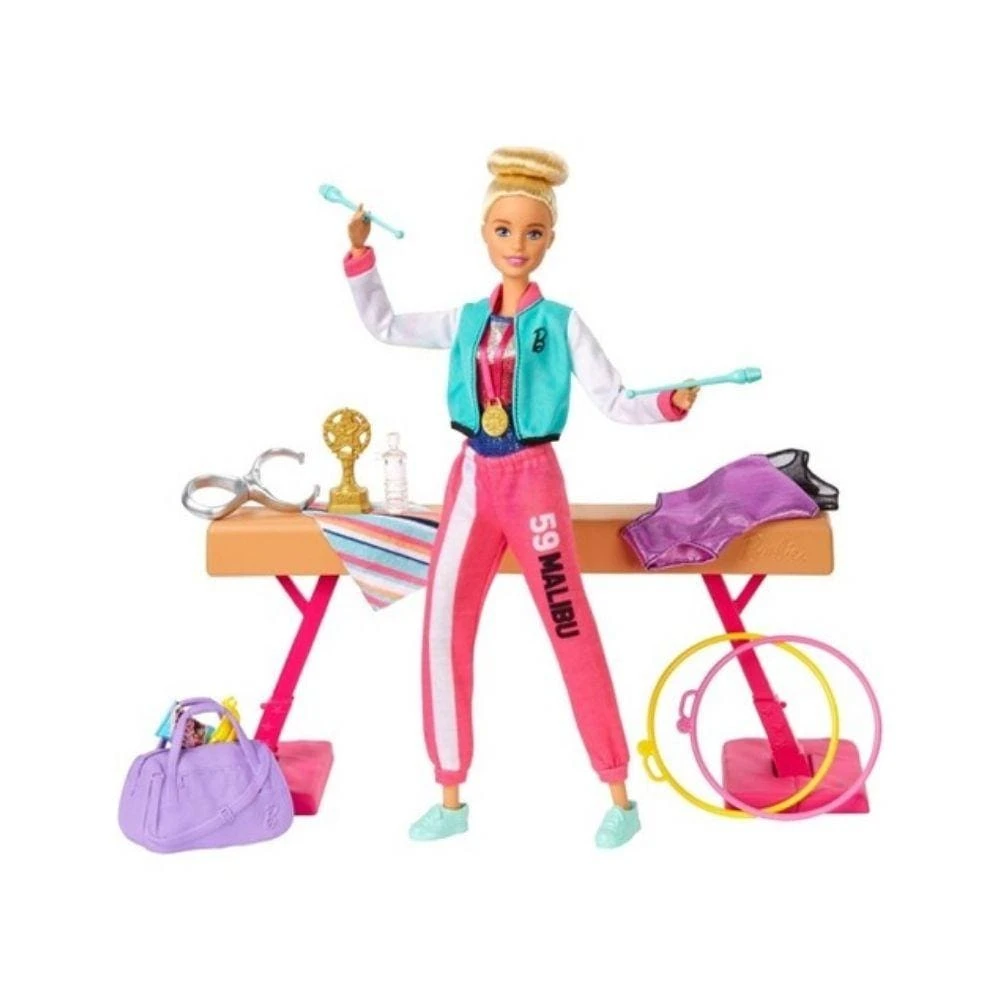 - Barbie Gymnast doll’s hard work, strength and determination lead her to a well-earned trophy and a medal with a ribbon. What a competition!
