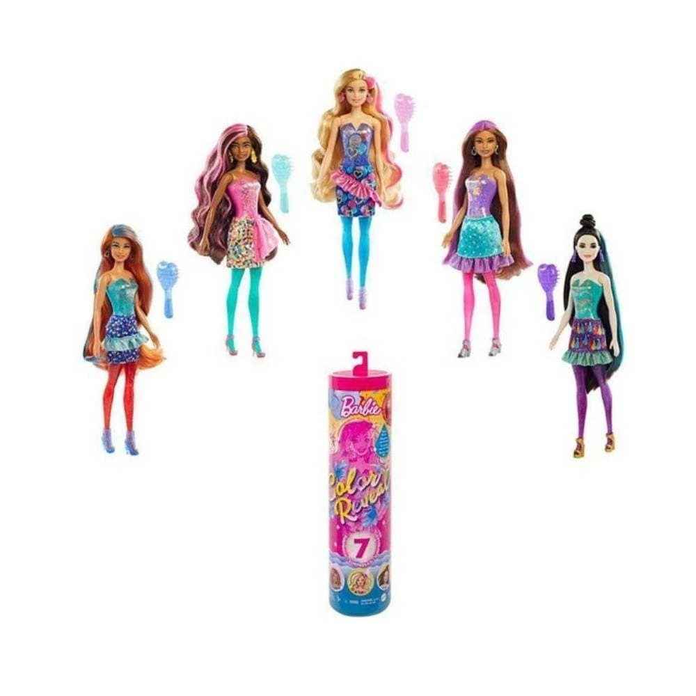 Each series has a unique theme — these Color RevealT dolls are party-themed with glitter-molded legs and a celebratory apparel. Use the tube to store the Barbier doll and accessories. Kids can collect them to mix and match accessories and expand the possibilities! Includes Barbier Color RevealT doll, fashion and accessories.?