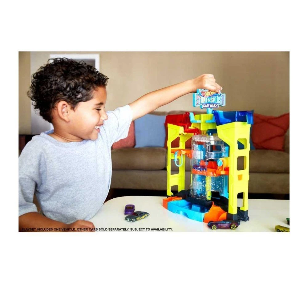 The Hot Wheels Stunt Splash Car Wash playset combines practical elements of a real-life car wash with the action-packed world of Hot Wheels. A crank elevator carries cars through an intricate set-up that leads to a rain-pipe where kids release water onto the cars. Kids control whether it´s hot or cold water, which changes the color of any Hot Wheels Color Shifter. The Hot Wheels Stunt Splash Car Wash connects to other Hot Wheels City sets (sold separately) for adventures all over the city. Ages four years old and up will find hours of playtime thrills with this set. Colors and decorations may vary.