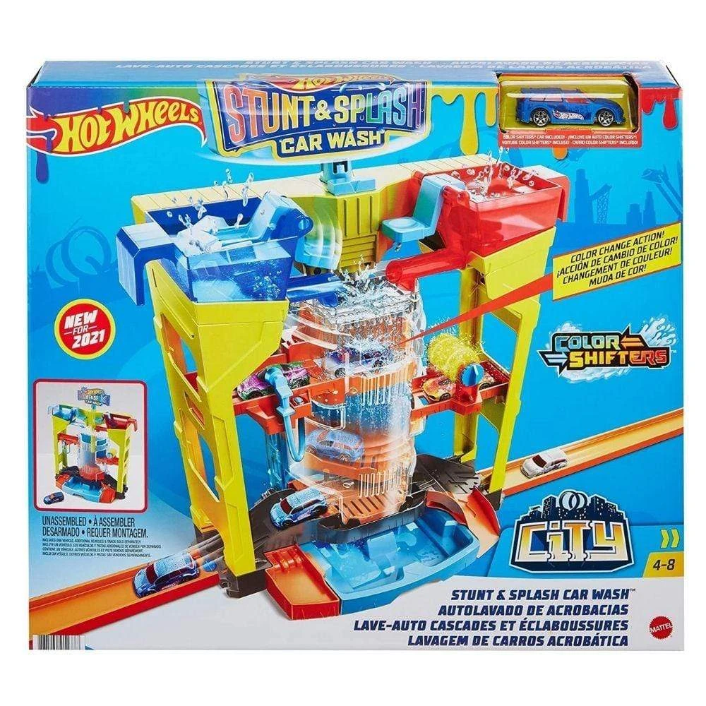 – Kids can pull up to the Hot Wheels Stunt Splash Car Wash playset for a tidal wave of action – this real-life inspired carwash set adds a kid-controlled hot and cold waterfall to change the color of the included Hot Wheels Color Shifter 1:64 scale car!